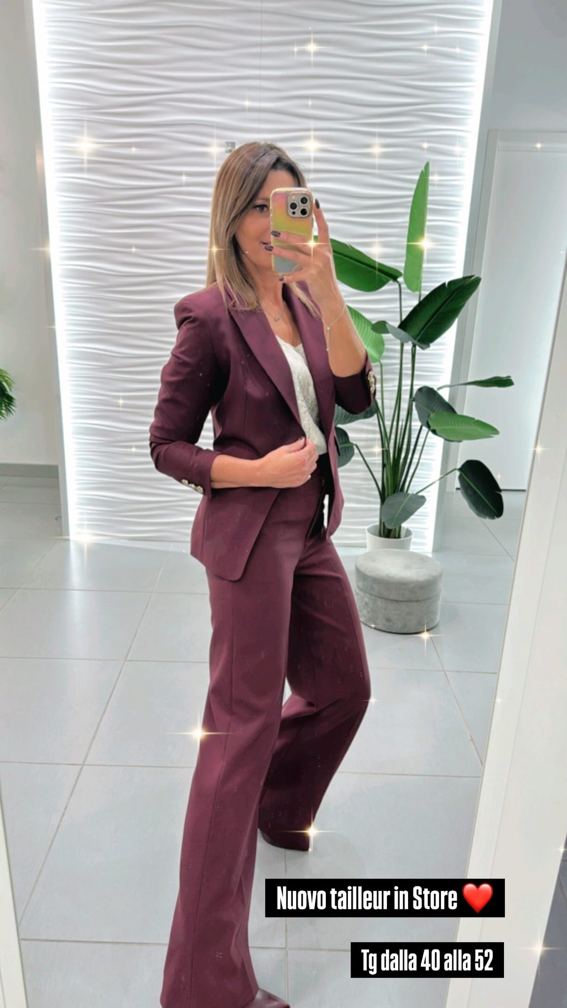 Tailleur bordeaux gessato oro con bottoni oro doppiopetto